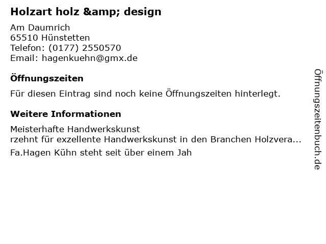 | Öffnungszeiten Holzart holz & design in Hünstetten anzeigen | |