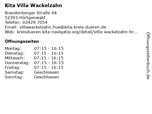 | Öffnungszeiten Kita Villa Wackelzahn in Hürtgenwald anzeigen | |