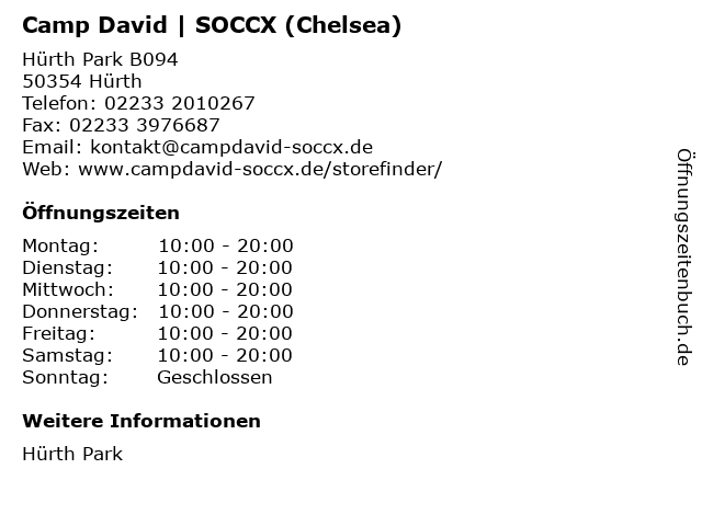 | Öffnungszeiten Camp David | SOCCX (Chelsea) in Hürth anzeigen | |
