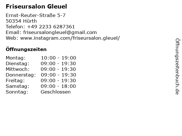 | Öffnungszeiten Friseursalon Gleuel in Hürth anzeigen | |
