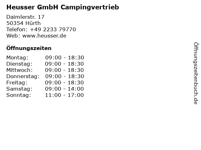 | Öffnungszeiten Heusser GmbH Campingvertrieb in Hürth anzeigen | |