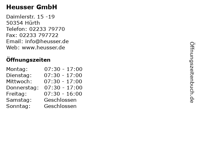 | Öffnungszeiten Heusser GmbH in Hürth anzeigen | |