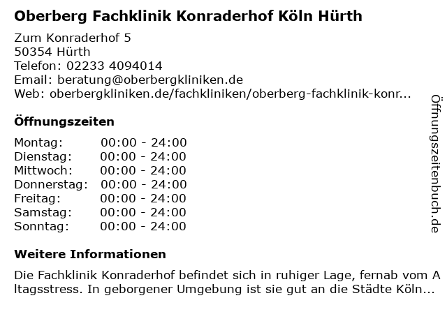 1 Oberberg Fachklinik Konraderhof - Private Fachkliniken im Bereich Psychiatrie, Psychosomatik & Psychotherapie (Entfernung: 0,07 km) Zum Konraderhof 5, 50354 Hürth 4 CG Lympha GmbH Fachklinik für Operative Lymphologie (Entfernung: 7,03 km) Bachemer Str. 30, 50931 Köln 6 |