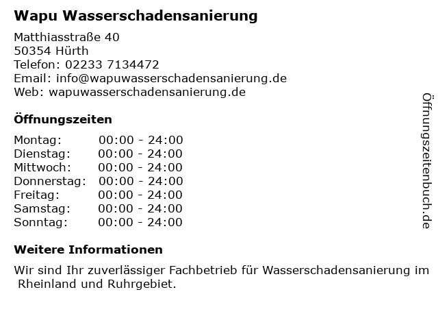 | Öffnungszeiten Wapu Wasserschadensanierung in Hürth anzeigen | |