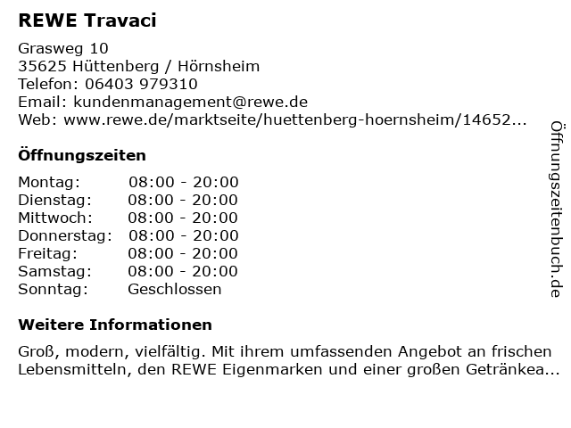 | Öffnungszeiten REWE Travaci in Hüttenberg / Hörnsheim anzeigen | |