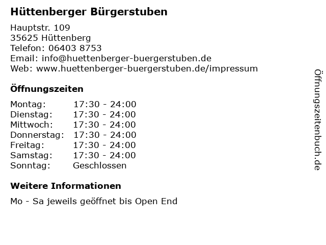 | Öffnungszeiten Hüttenberger Bürgerstuben in Hüttenberg anzeigen | |