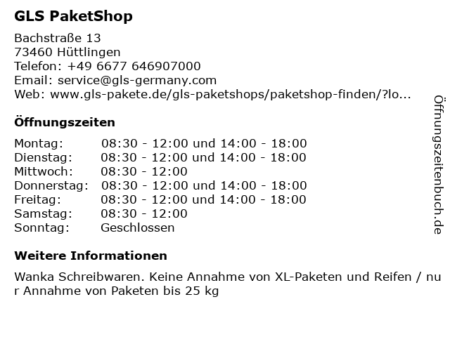 | Öffnungszeiten GLS PaketShop in Hüttlingen anzeigen | |