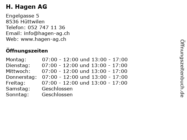 | Öffnungszeiten H. Hagen AG in Hüttwilen anzeigen | |