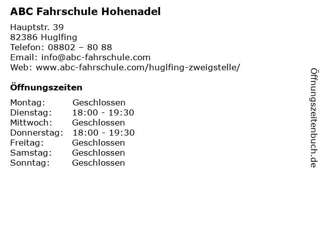 | Öffnungszeiten ABC Fahrschule Hohenadel in Huglfing anzeigen | |