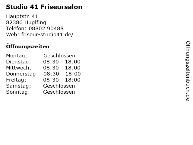 | Öffnungszeiten Studio 41 Friseursalon in Huglfing anzeigen | |