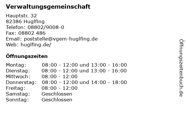 | Öffnungszeiten Verwaltungsgemeinschaft in Huglfing anzeigen | |