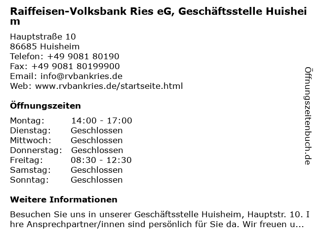 Branchen & Suchbegriffe zu Raiffeisen-Volksbank Ries eG, Geschäftsstelle Huisheim:eg, geldautomat, geschäftsstelle, huisheim, kontoauszugdrucker, raiffeisen, ries, volksbank |