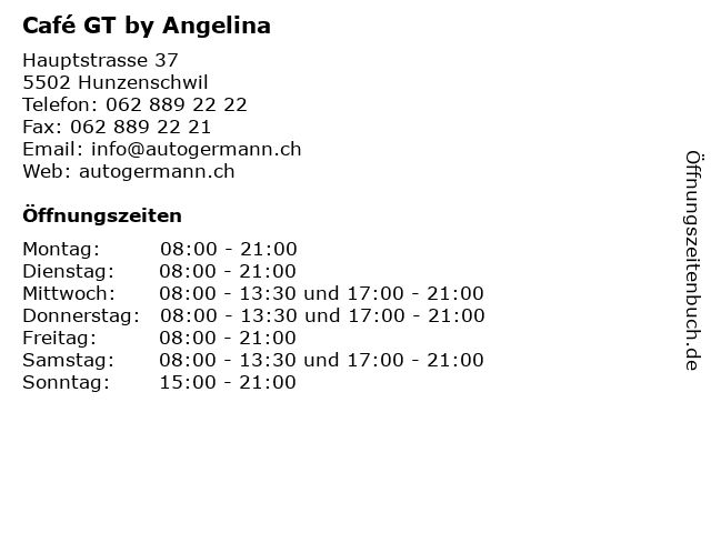 | Öffnungszeiten Café GT by Angelina in Hunzenschwil anzeigen | |