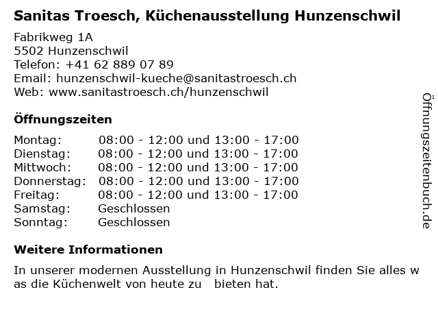 1 Sanitas Troesch, Küchenausstellung Hunzenschwil (Entfernung: 0,00 km) Fabrikweg 1A, 5502 Hunzenschwil 6 |