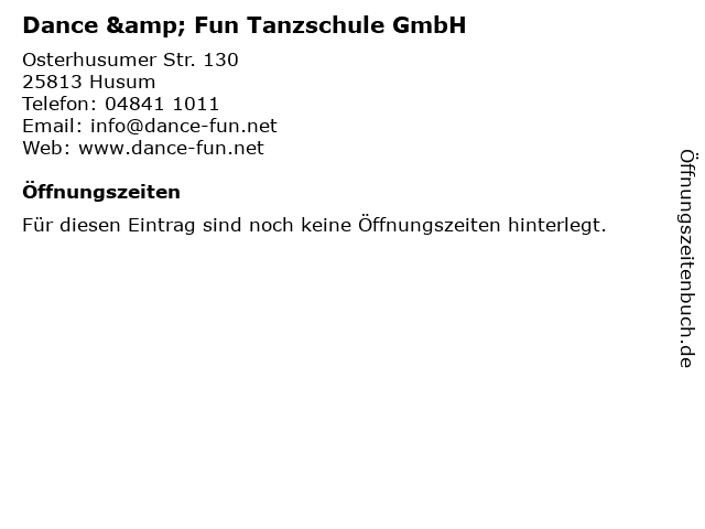 | Öffnungszeiten Dance & Fun Tanzschule GmbH in Husum anzeigen | |