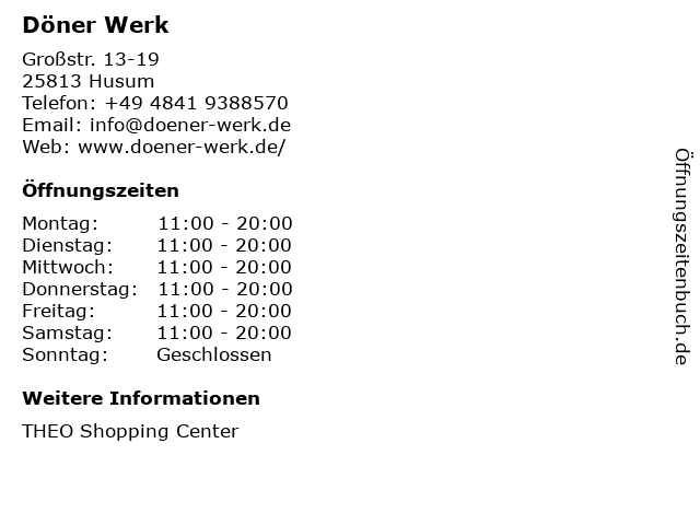 | Öffnungszeiten Döner Werk in Husum anzeigen | |