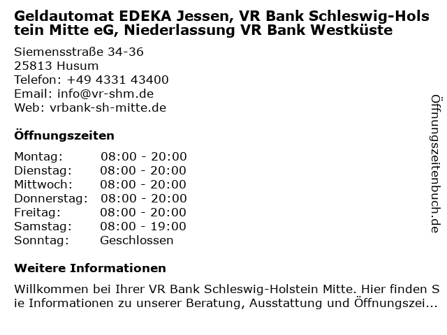 Branchen & Suchbegriffe zu Geldautomat EDEKA Jessen, VR Bank Schleswig-Holstein Mitte eG, Niederlassung VR Bank Westküste:bank, edeka, eg, geldautomat, holstein, mitte, niederlassung, vr, westküste |
