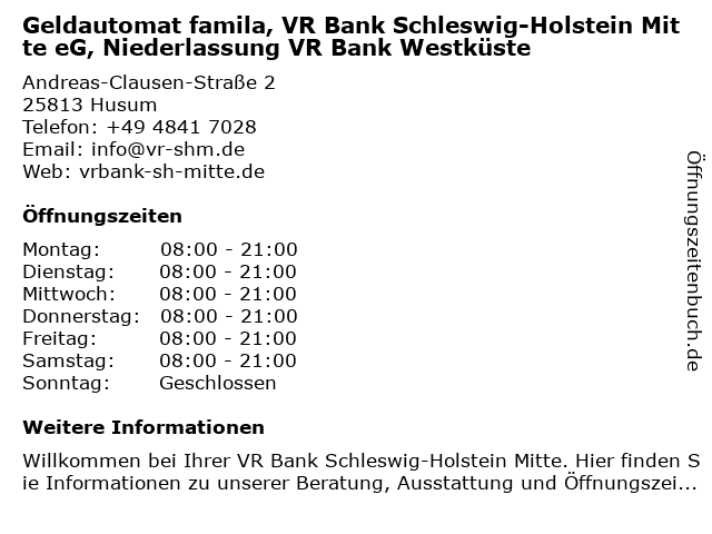 Branchen & Suchbegriffe zu Geldautomat famila, VR Bank Schleswig-Holstein Mitte eG, Niederlassung VR Bank Westküste:bank, eg, famila, geldautomat, holstein, mitte, niederlassung, vr, westküste |