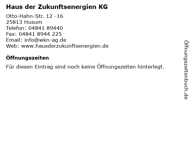 | Öffnungszeiten Haus der Zukunftsenergien KG in Husum anzeigen | |