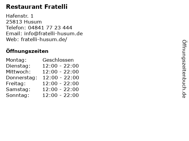 | Öffnungszeiten Restaurant Fratelli in Husum anzeigen | |