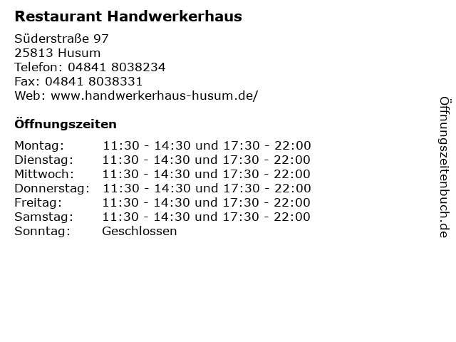 | Öffnungszeiten Restaurant Handwerkerhaus in Husum anzeigen | |