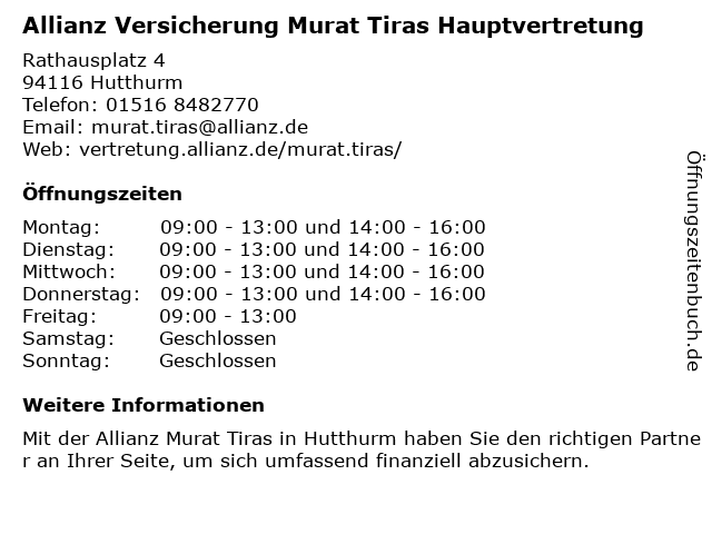 1 3 Thomas Steil Allianz Versicherungs-AG Hauptvertretung (Entfernung: 11,50 km) Marktplatz 12, 94051 Hauzenberg 4 Allianz Versicherung Alex Matseiko Hauptvertretung (Entfernung: 11,75 km) Steinbachstraße 13, 94036 Passau 5 Allianz Versicherung Julia Heindl Hauptvertretung (Entfernung: 12,24 km) Bannholzstraße 30, 94065 Waldkirchen 6 |