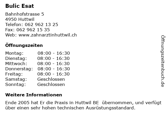| Öffnungszeiten Bulic Esat in Huttwil anzeigen | |
