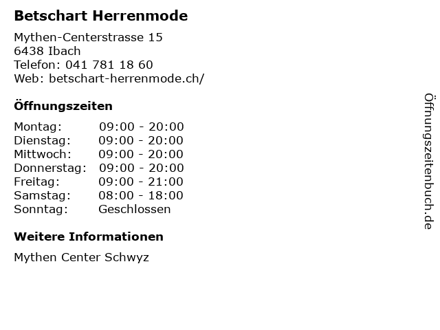 | Öffnungszeiten Betschart Herrenmode in Ibach anzeigen | |