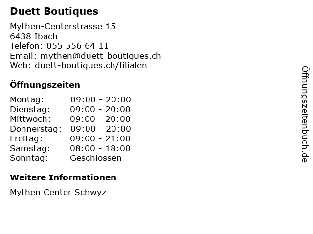| Öffnungszeiten Duett Boutiques in Ibach anzeigen | |