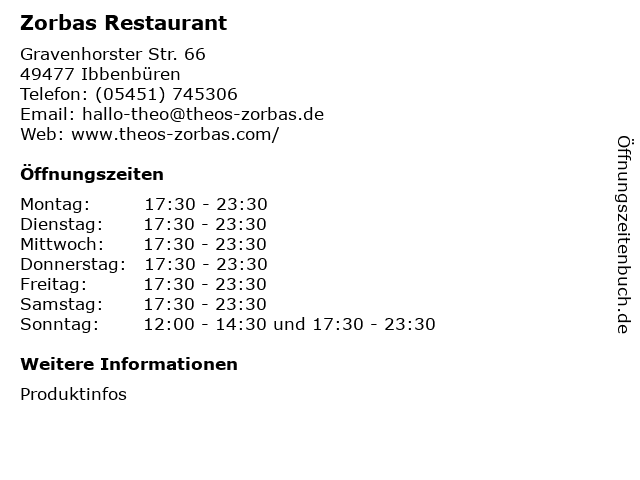 | Öffnungszeiten Zorbas Restaurant in Ibbenbüren anzeigen | |