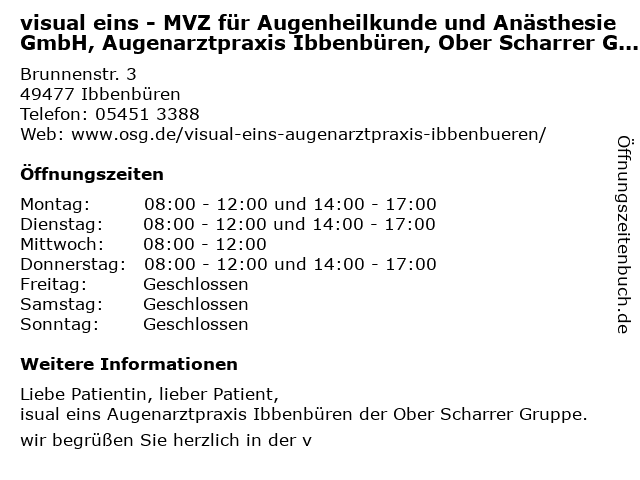 | Branchen & Suchbegriffe zu visual eins - MVZ für Augenheilkunde und Anästhesie GmbH, Augenarztpraxis Ibbenbüren, Ober Scharrer Gruppe:anästhesie, augenarztpraxis, augenheilkunde, eins, gruppe, mvz, ober, scharrer, visual |