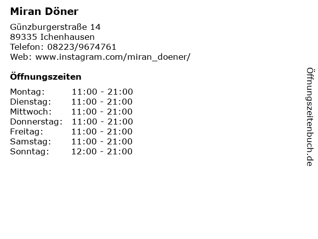 | Öffnungszeiten Miran Döner in Ichenhausen anzeigen | |