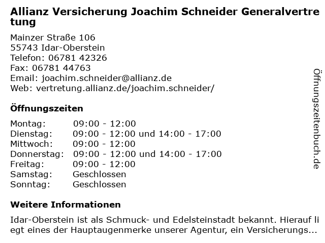 1 Allianz Versicherung Nadine Hempel Generalvertretung (Entfernung: 12,63 km) Auf Dem Römer 15, 55765 Birkenfeld 2 Allianz Versicherung - Generalvertretung Krebs H.und Schneider J. (Entfernung: 13,10 km) Altstadt 3, 55606 Kirn 3 Allianz - Helmut Krebs und Joachim Schneider Generalvertretung (Entfernung: 13,10 km) Altstadt 3, 55606 Kirn 6 Dipl. Kfm. Jürgen H. Schneider | Steuerberater (Entfernung: 0,65 km) Hauptstr. 119-121, 55743 Idar-Oberstein |