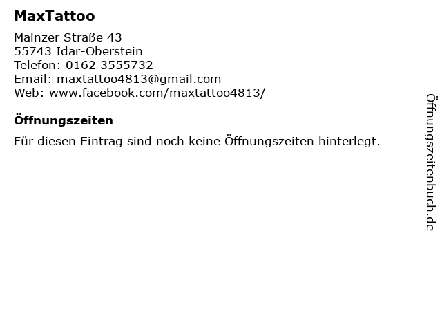 | Öffnungszeiten MaxTattoo in Idar-Oberstein anzeigen | |