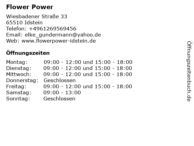 | Öffnungszeiten Flower Power in Idstein anzeigen | |