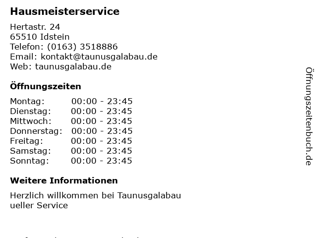 | Öffnungszeiten Hausmeisterservice in Idstein anzeigen | |