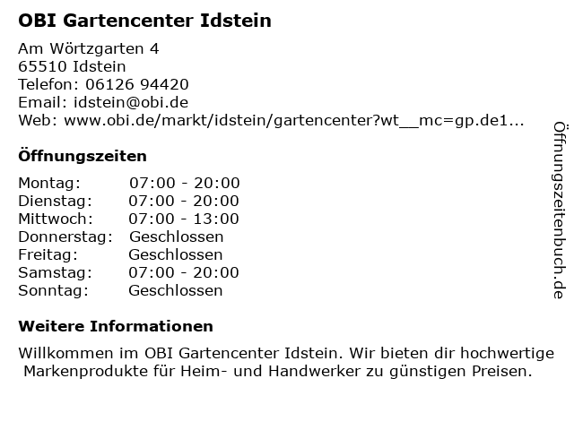 | Öffnungszeiten OBI Gartencenter Idstein in Idstein anzeigen | |