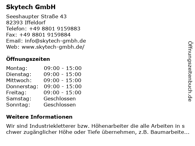 | Öffnungszeiten Skytech GmbH in Iffeldorf anzeigen | |