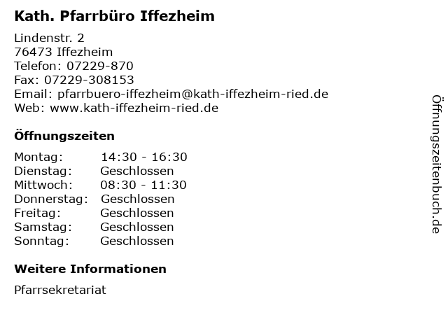 | Öffnungszeiten Kath. Pfarrbüro Iffezheim in Iffezheim anzeigen | |