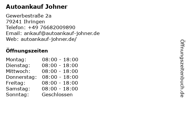 | Öffnungszeiten Autoankauf Johner in Ihringen anzeigen | |