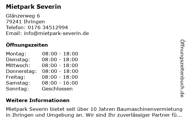 | Öffnungszeiten Mietpark Severin in Ihringen anzeigen | |