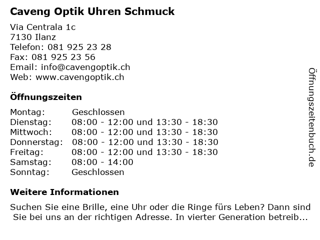 | Öffnungszeiten Caveng Optik Uhren Schmuck in Ilanz anzeigen | |