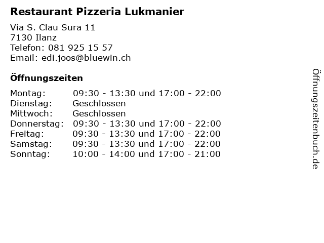 | Öffnungszeiten Restaurant Pizzeria Lukmanier in Ilanz anzeigen | |