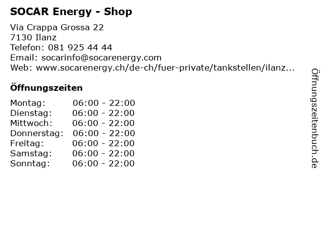 | Öffnungszeiten SOCAR Energy - Shop in Ilanz anzeigen | |