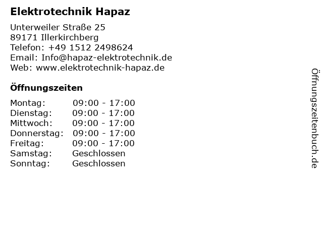 | Öffnungszeiten Elektrotechnik Hapaz in Illerkirchberg anzeigen | |