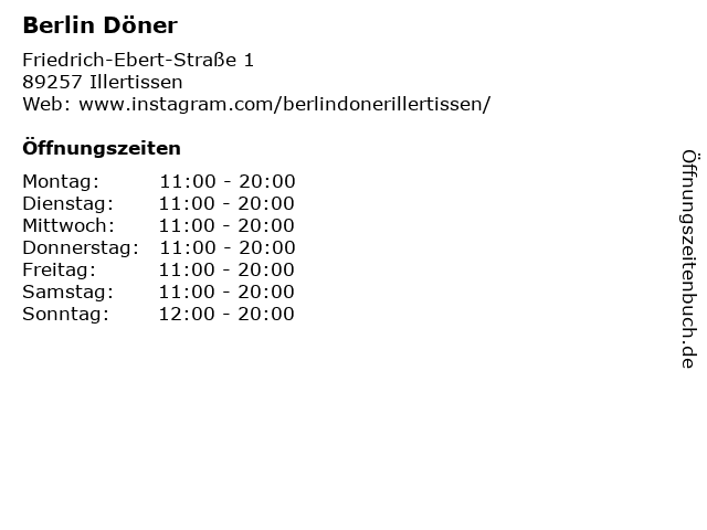 | Öffnungszeiten Berlin Döner in Illertissen anzeigen | |