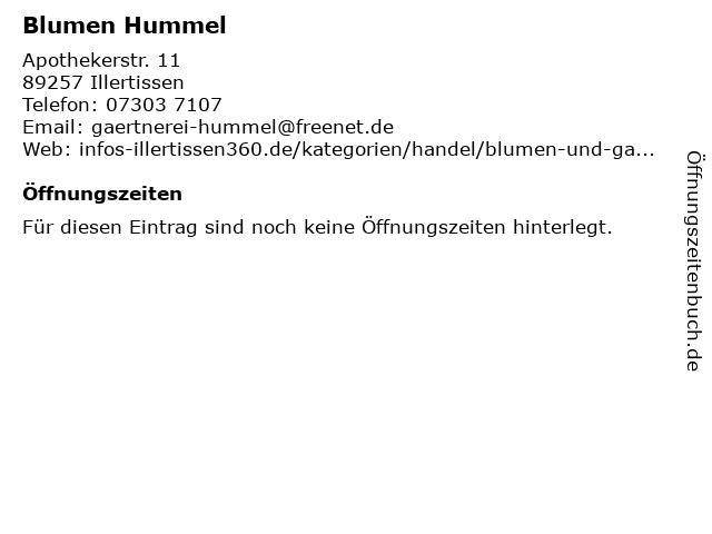 | Öffnungszeiten Blumen Hummel in Illertissen anzeigen | |