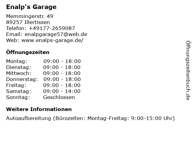 | Öffnungszeiten Enalp's Garage in Illertissen anzeigen | |
