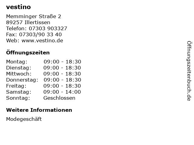 | Öffnungszeiten vestino in Illertissen anzeigen | |