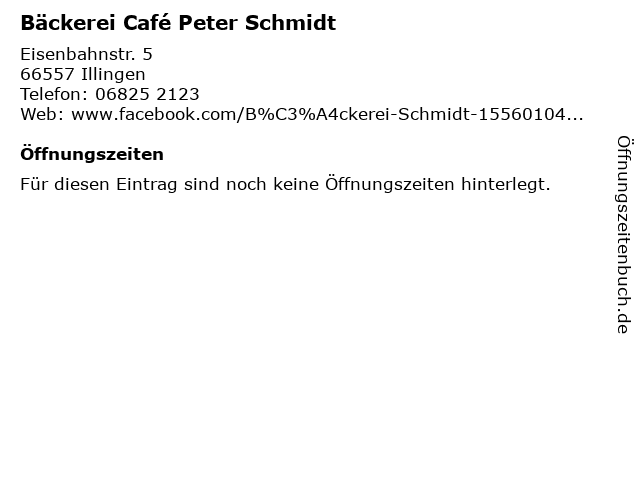 | Öffnungszeiten Bäckerei Café Peter Schmidt in Illingen anzeigen | |